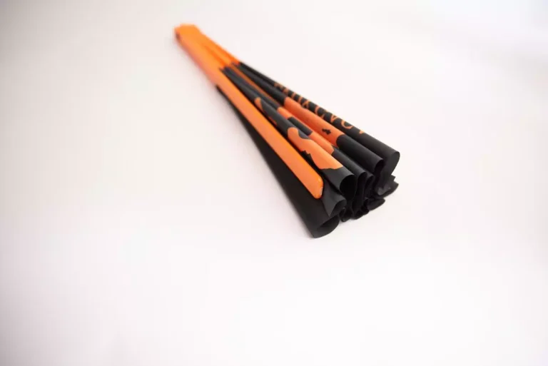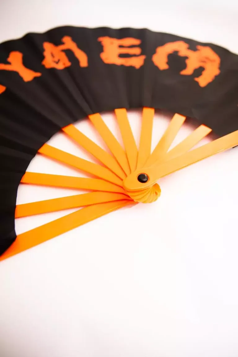 Leque decorativo fabricado com haste de plástico e tecido de em nylon.