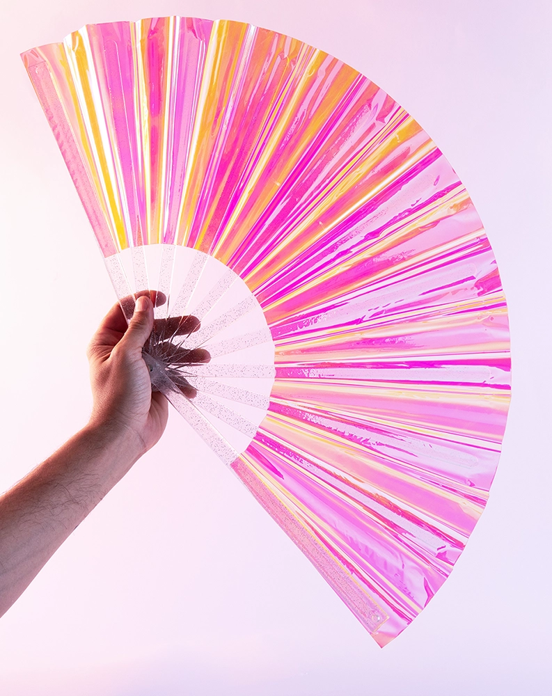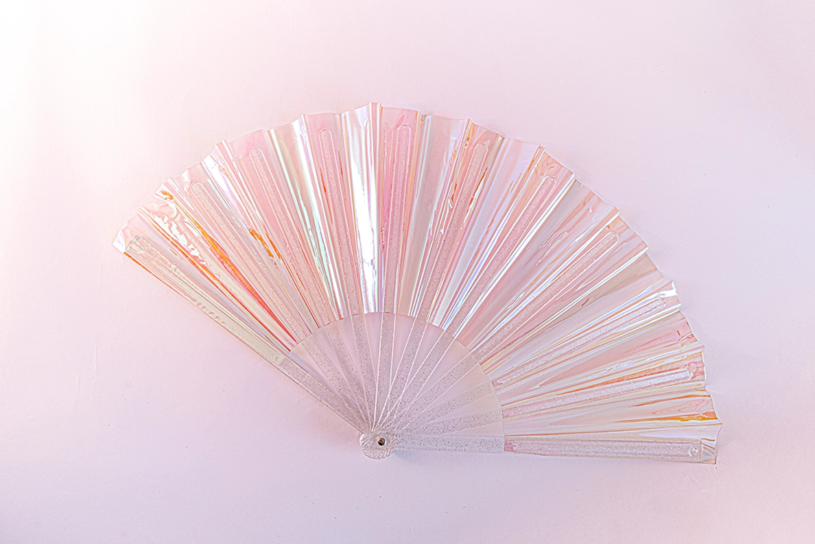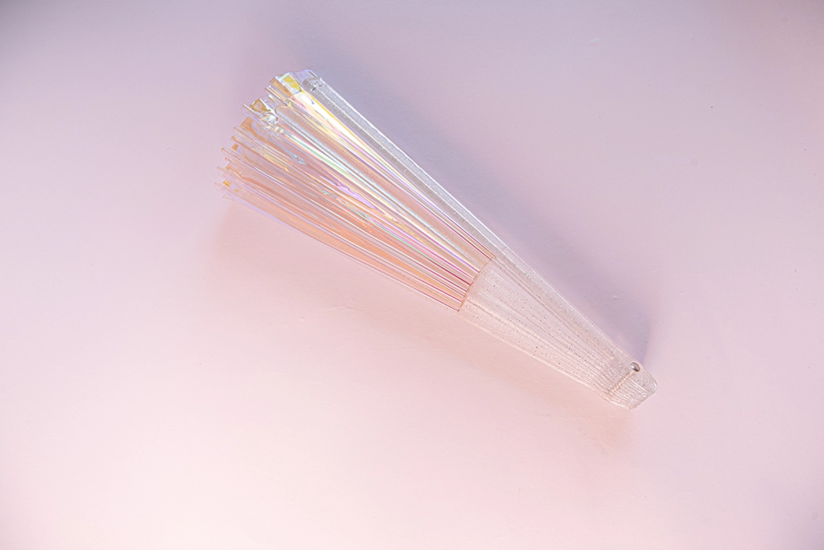Possui hastes transparentes com pequenos detalhes em glitter também, conferindo um visual especial ao leque
